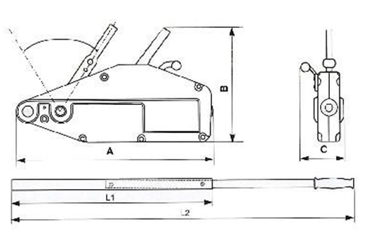 額定起重量(KG) 額定收拉力N 額定前進行程 鋼絲繩直徑(mm) 鋼絲繩安全系數 整機安全系數 最大載荷(KG) 整機重量(KG) 整機尺寸 L1(mm) L2(mm)